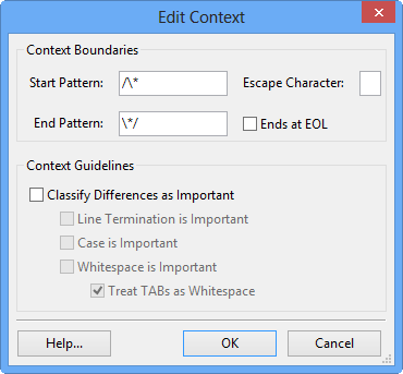 The Define New/Edit Context Dialog lets you define the boundaries of a Context. A Context is a mechanism for identifying portions of a document that should be specially handled such as a string literal or comment.